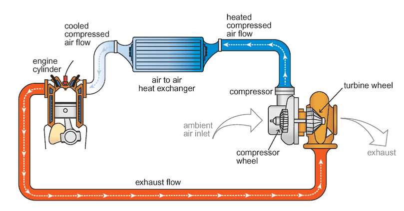 Heat is removed by transferring the heated compressed air through a radiator air-to-air heat exchanger, allowing it to cool before entering the engine to optimise power and performance. The goal is to lower the engine’s intake air temperature to improve emissions and output power efficiency.