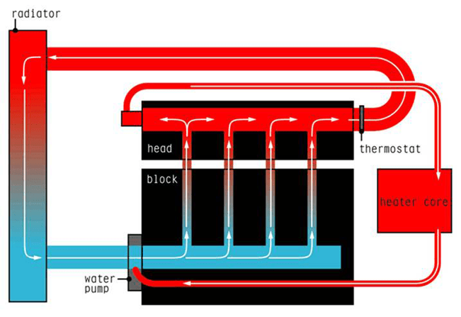 After absorbing the heat from the engine, the coolant flows to the radiator/heat exchanger, where the fin helps dissipate the heat from the coolant, lowering its temperature. The fins in term will be cooled by the radiator fan, which pulls in cool ambient air. Once cooled, the coolant returns to the engine through the water pump, repeating the cooling cycle until the engine reaches a stable temperature.